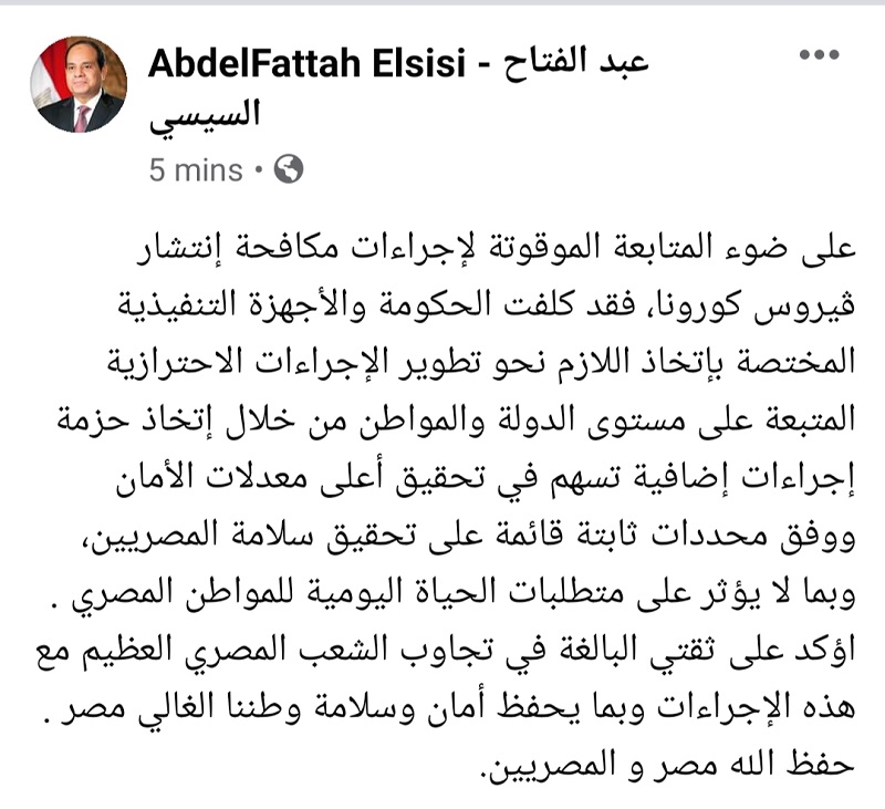 وكتب الرئيس خلال صفحته الرسمية على موقع “فيس بوك”: “على ضوء المتابعة الموقوتة لإجراءات مكافحة انتشار ڤيروس كورونا، فقد كلفت الحكومة و الأجهزة التنفيذية المختصة باتخاذ اللازم نحو تطوير الإجراءات الاحترازية المتبعة على مستوى الدولة والمواطن من خلال اتخاذ حزمة إجراءات إضافية تسهم فى تحقيق أعلى معدلات الأمان ووفق محددات ثابتة قائمة على تحقيق سلامة المصريين، وبما لا يؤثر على متطلبات الحياة اليومية للمواطن المصرى”.