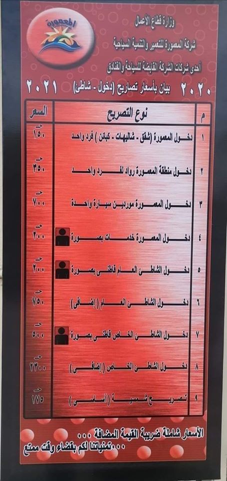أعلنت شركة المعمورة للتعمير والتنمية السياحية أسعار التصاريح الجديدة لعام 2020/2021 الخاصة بدخول بوابات وشواطئ منطقة المعمورة الشاطئ السياحية علي النحو التالي: