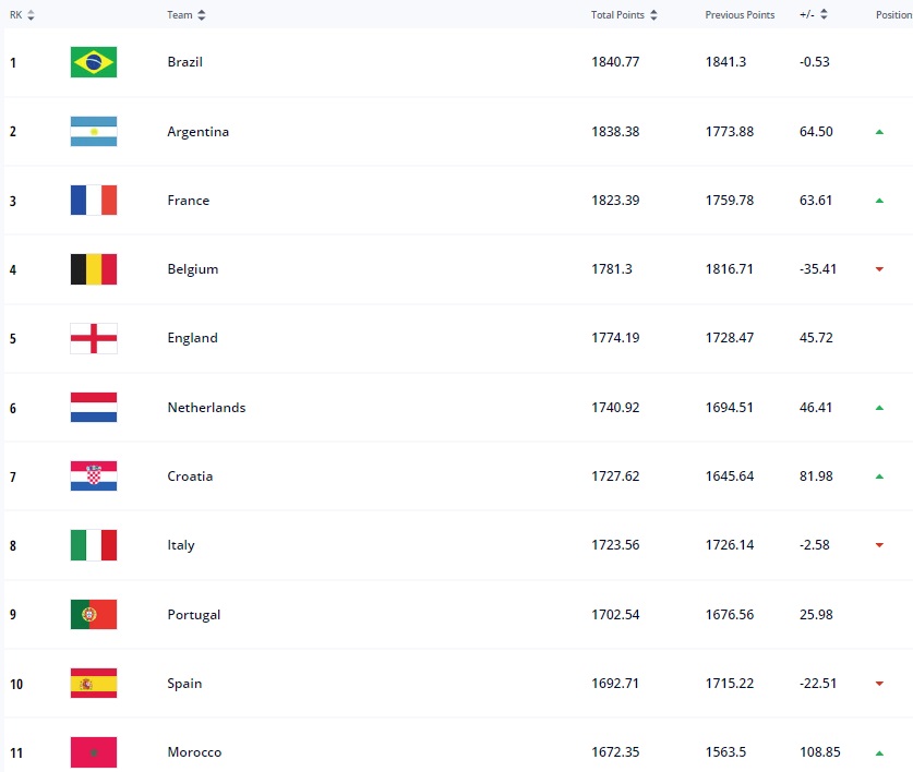ورغم خروجه من دور الثمانية لمونديال 2022، احتفظ منتخب البرازيل بالصدارة، بينما قفز منتخب الأرجنتين بطل العالم للمركز الثاني، خلفه فرنسا، بينما هبط منتخب بلجيكا للمركز الرابع، وبقى منتخب إنجلترا خامسا.